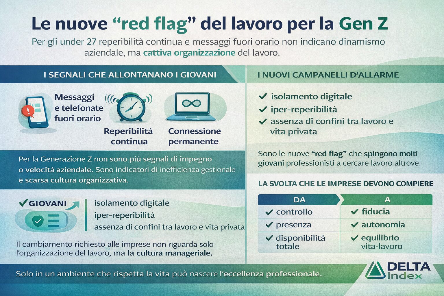 L’isolamento digitale e l’iper-reperibilità sono i nuovi segnali d’allarme che spingono un giovane a cercare altrove. Il passo da compiere è, dunque, quello di trasformare il controllo in fiducia e lo spazio fisico in valore relazionale, comprendendo che il talento under 27 non cerca un padrone del proprio tempo, ma un partner che metta al centro la persona prima ancora della mansione, perché solo in un ambiente che rispetta la vita può fiorire l’eccellenza professionale.