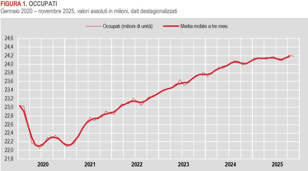 Nel confronto annuale, il mercato del lavoro italiano continua a mostrare segnali di tenuta e, per molti aspetti, di consolidamento. I dati Istat di novembre – al netto di una fisiologica flessione mensile – confermano un quadro complessivamente positivo: livelli occupazionali ancora molto elevati nel confronto storico, disoccupazione in calo e una composizione dell’occupazione che, nel medio periodo, tende a migliorare.